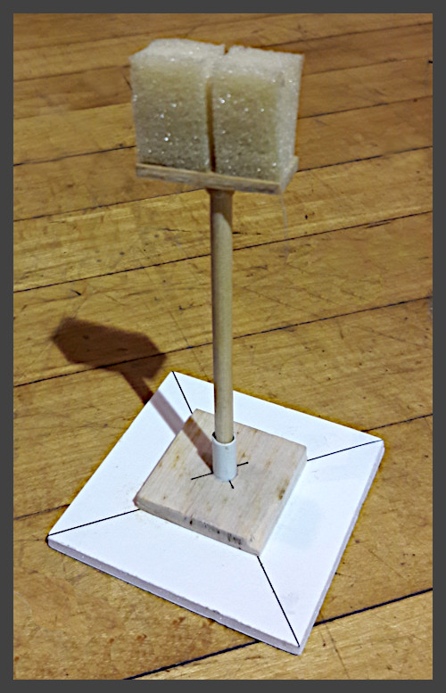 Pictured here is Gary’s design for the stand but it can be made any way the maker chooses. The size of the weighing platform dictated the 3″ square base that Gary went with. The base can be made of sheet balsa or in Gary’s case, 3/16″ foam core board. A space between the foam blocks holds the part or model gently but firmly.
