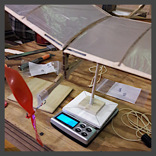 The concept is rather simple. It’s a stand to hold individual parts (as well as the models themselves) of indoor models safely on the platform of whatever digital scale you might have. Gary points out that the purchase of a relatively inexpensive digital pocket kitchen scale “providing accurate and instant measurements from “0.01g to 220g” is almost a must if you are seriously into indoor models. In addition he adds “Getting a handle on the actual weight of say—the prop and prop shaft— or the wing and other parts individually can make a difference, especially when it comes to figuring out the center of gravity. By weighing the parts separately, you can determine which parts are to heavy or where one is allowed to add more weight. All the parts need to be in harmony with the others. Then it’s on to find the right motor plus the right number of turns of the motor, but at least at that point the plane itself is balanced.”