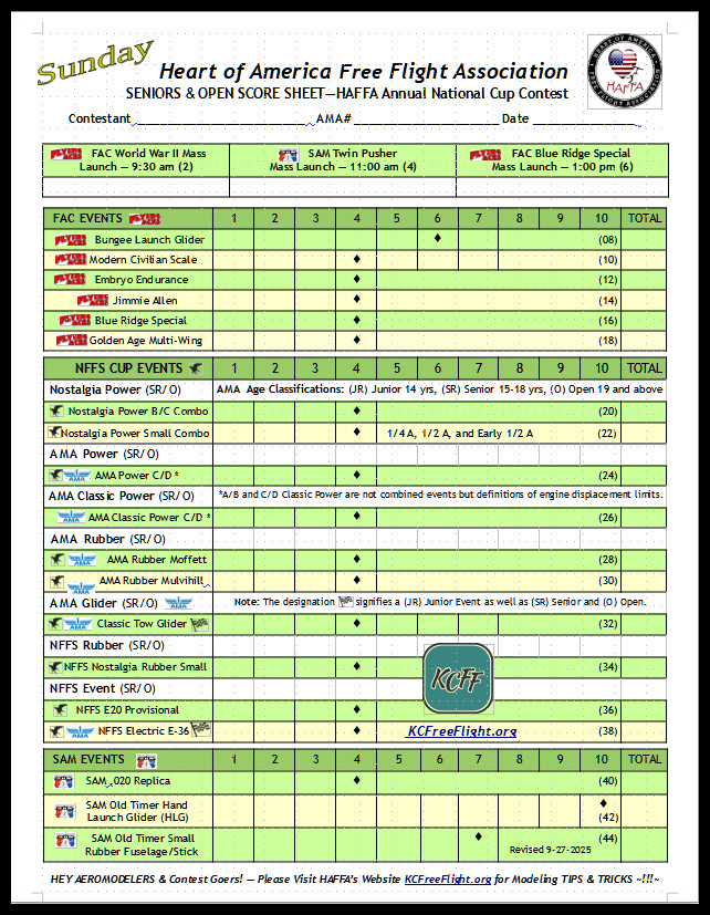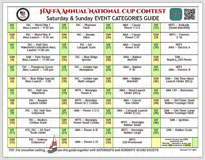 TO AID CONTESTANTS, by using all three of the documents together, you’ll find that all of the forms adhere to a New Numbering System that consists of having each category of model airplane event having its own unique number, based on our total 45 EVENT CATEGORIES. Note that Saturday’s Event Categories are mostly odd numbered and that all of Sunday’s Event Categories are even numbered. Don’t panic!—the numbering system will soon become much clearer (and helpful) once you become familiar with the three documents!😁