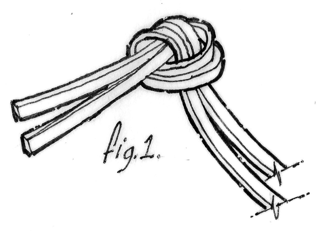Begin the braiding process by tying the ends of the strips in a simple overhand knot as shown in Fig. 1. It is essential that the rubber has had no prior lube applied to it. Using some spit, tighten the knot as tight as you can get it, just short of breaking as shown in Fig. 2. The spit will evaporate. Finish the knot by by using a simple “T” knot (Fig. 3.) and again using spit, tighten it to near breaking.