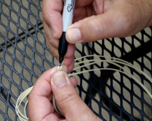 Continuing on, grab the top of the loop as shown in Fig 5. and fold the loop exactly in half and mark the center point of with a Magic Marker “Sharpie”on each of the two strands as shown at left. Unfold the loop and place the knot end on a winding peg and the other on the hook of your winder, keeping the two center marks on the rubber strands lined up with each other. Now put some winds on the loop going Clockwise. This is important as will be explained later. 60 to 75 winds are sufficient or 4 to 5 turns on a 15:1 winder.