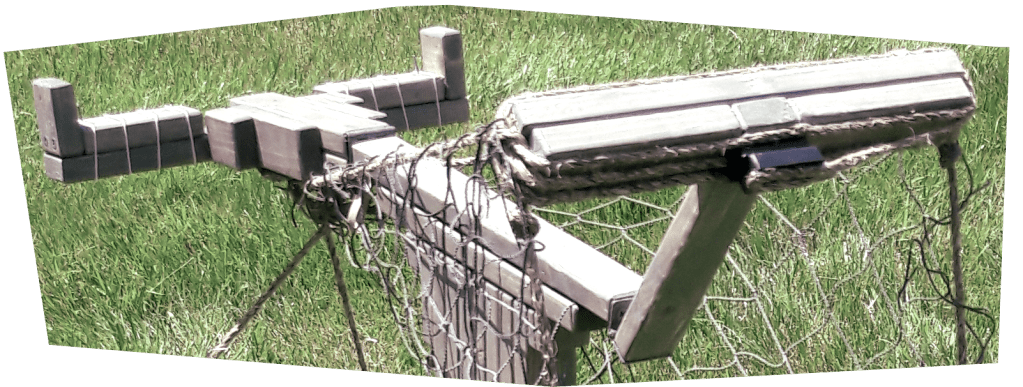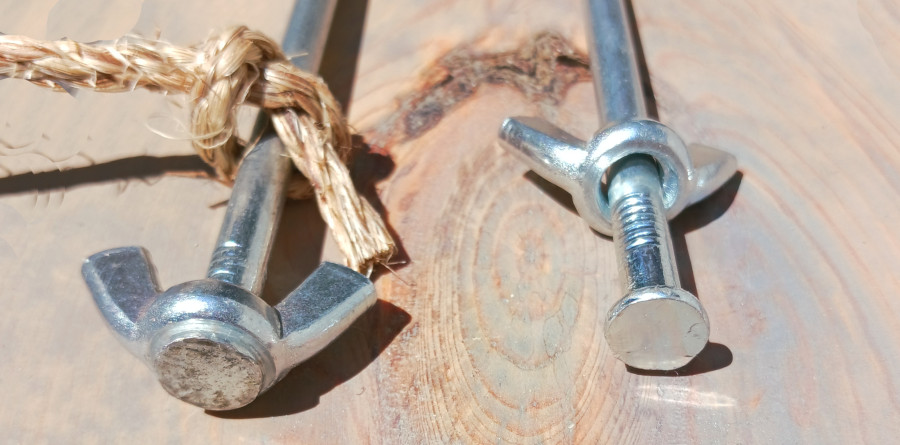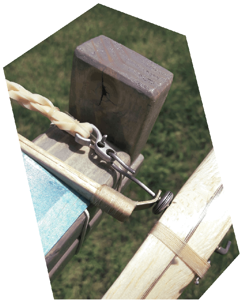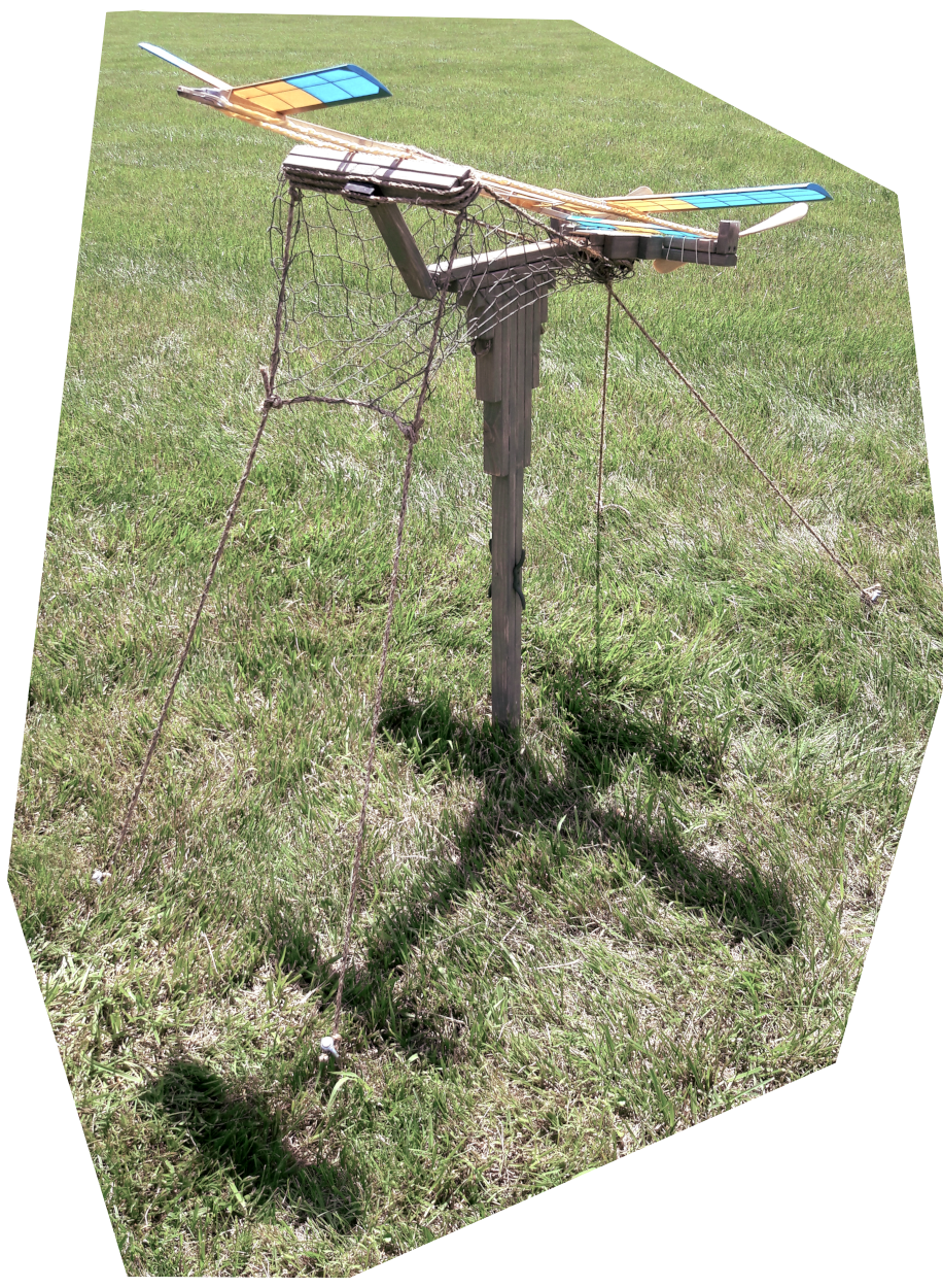 Tent stakes are a necessity when it comes to holding down tents of course but in our case also “Winding Platforms.” Our Winding Platform utilizes four (4) ropes that function as “Guy Wires” to keep the Platform upright, steady (without twisting), and securely held down so the platform can carry out its intended task of winding rubber motors. The “Guy Wire” ropes terminate at the ground with tent stakes that are driven into the soil with a hammer.