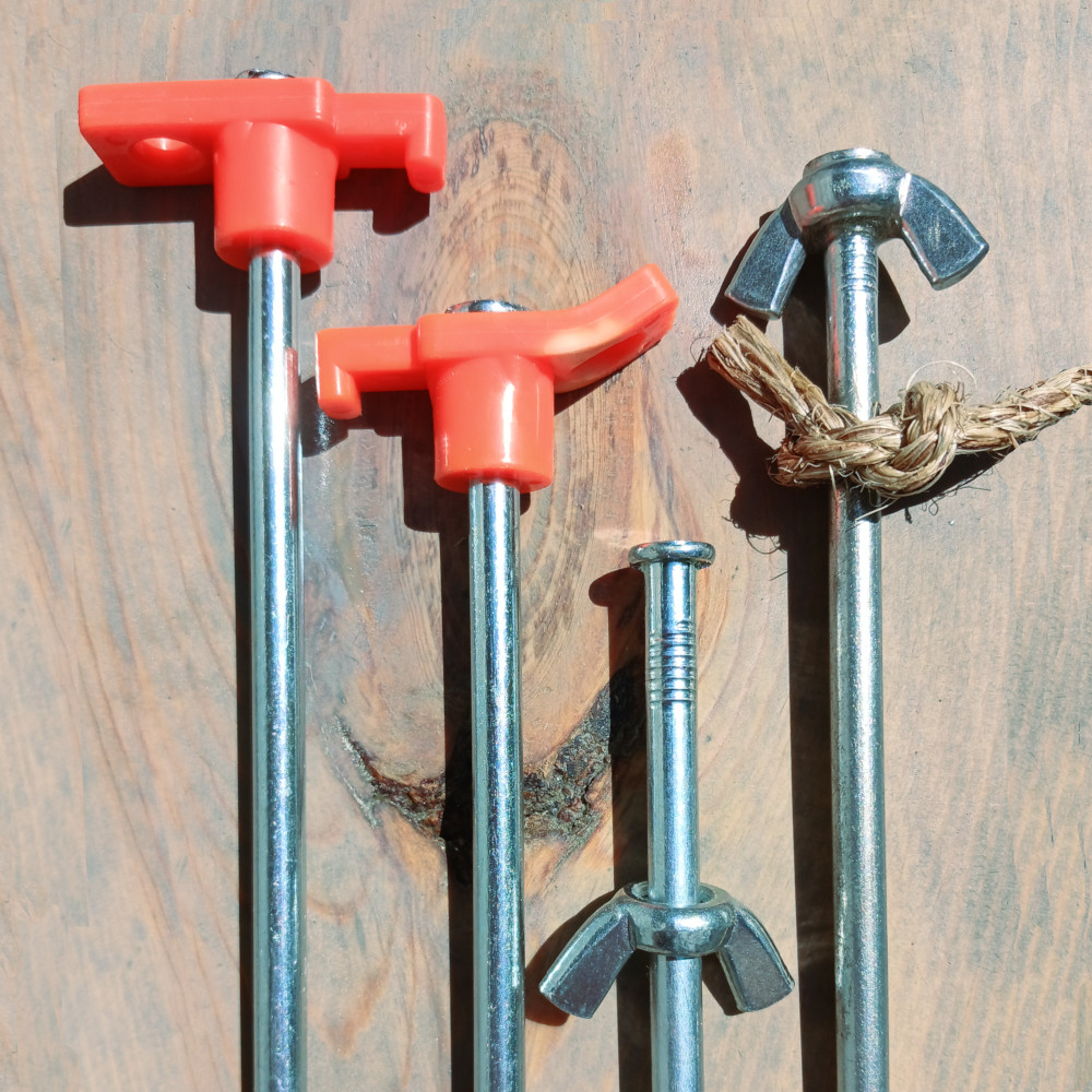 Left to right (1) New Tent Stake (2) Tent stake bent after repeated removals from the ground. (3 & 4) Wingnut Solution.