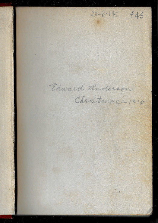 To my surprise I was delighted to find a hand written note in pencil documenting that the original owner received this copy four years after it was published as a Christmas present in 1918, as documented in a hand written pencil note handsomely penned in cursive lettering, as the closeup clearly shows. (Is Cursive a lost art? One would hope not . . .😔)