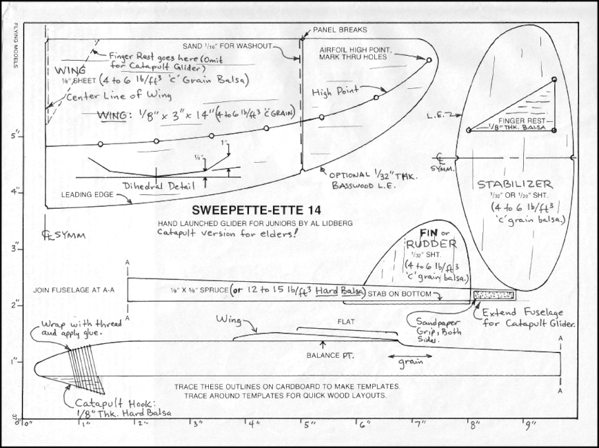 Several months ago I found an old article from Flying Models magazine (November 1979 issue) on Al Lidberg’s Sweepette-Ette 14 hand launched glider, and I marked up the plan for this glider to make a catapult version of it and then sent the PDF file for the magazine article and marked up plan to several model airplane friends, including Jeff Renz.  I forgot all about this glider until Jeff emailed me a couple of weeks ago asking me if he could put the article and plan on the HAFFA website.  I told him to go ahead, then I immediately decided to build one to see how well it would fly.