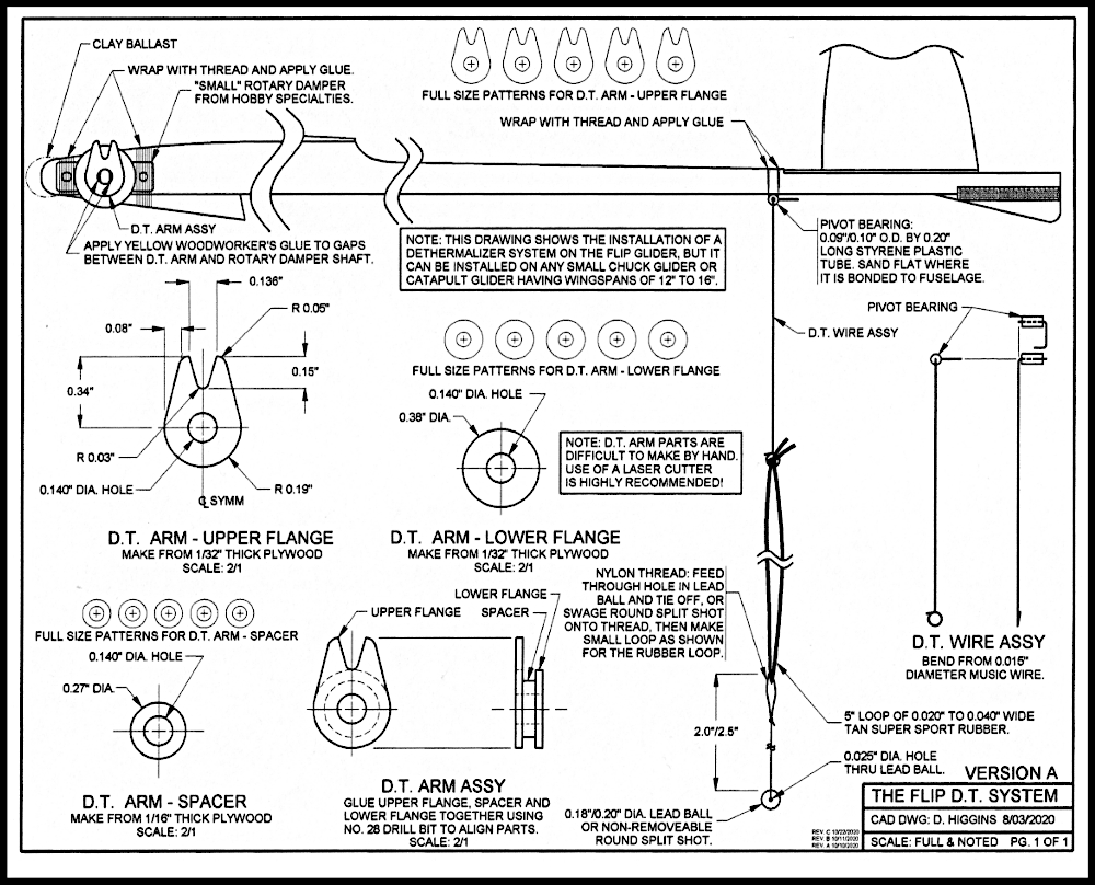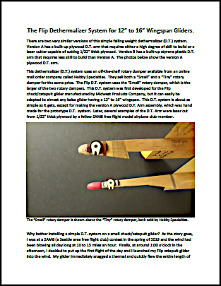 This dethermalizer (D.T.) system uses an off-the-shelf rotary damper available from an online mail order company called Hobby Specialties. They sell both a “Small” and a “Tiny” rotary damper for the same price. The Flip D.T. system uses the “Small” rotary damper, which is the larger of the two rotary dampers. This D.T. system was first developed for the Flip chuck/catapult glider manufactured by Midwest Products Company, but it can easily be adapted to almost any balsa glider having a 12” to 16” wingspan. This D.T. system is about as simple as it gets, except for making the version A plywood D.T. Arm assembly, which was hand made for the prototype D.T. system. Later, several examples of the D.T. Arm were laser cut from 1/32” thick plywood by a fellow SAM8 free flight model airplane club member.