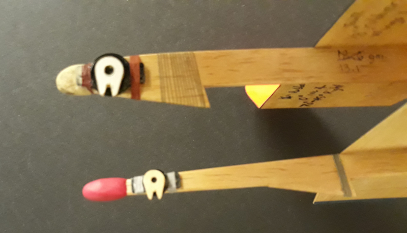 - Build the D.T. Arm Assembly, which consists of the upper flange (the actual timer arm with the “V” slot), a spacer and a lower flange. See the Flip D.T. System drawing (version A or version B) for the detail part dimensions. If you are building the version A plywood D.T. arm, you will save a lot of time and frustration If you know someone with a laser cutter willing to cut these parts for you. I built the prototype version A plywood D.T. arm using tiny homemade brass hole saw cutters, a drill press, a precision disk sander a Dremel rotary tool and a number 28 drill bit. Fortunately, I was able to get a fellow SAM8 club member to cut the D.T. arm parts out on his professional grade laser cutter; the parts came out perfect and saved me a bunch of time. He cut everything from 1/32” thick plywood, so he made two 1/32” thick spacers instead of the one 1/16” thick spacer called out on the plan. Make sure to orient the long direction of the upper flange (the 1/32” thick part having the “V” slot) parallel with the grain of the exterior plies of the plywood. Use a number 28 drill bit shank to assemble the D.T. Arm parts. I used yellow wood worker’s glue to assemble the D.T. Arm parts. Make sure to use a toothpick to wipe off the excess glue that oozes out of the spacer/flange joints. After drying for a couple minutes, carefully slip the D.T. Arm Assembly off the drill bit shank using a 1 inch length of 3/32” O.D. brass tubing. Don’t wait too long or the D.T. Arm will be difficult if not impossible to remove from the drill bit shank. I recommend finishing the Version A plywood D.T. Arm Assembly with two coats of thinned nitrate dope or a coat of Minwax Helmsman Spar Urethane varnish. The version B styrene plastic D.T. arm is a much simpler design, requiring less time and skill to build. Although not absolutely necessary, the square corners on the plastic D.T. arm parts can be rounded to make them more professional looking. The plastic D.T. arm parts are glued together on the shank of a 1/8” diameter drill bit using Testors liquid cement for plastics. Once the glue has been applied to the plastic D.T. arm parts and they have been aligned on the drill bit shank, quickly remove the D.T. arm assembly from the shank to prevent it from bonding permanently to the shank. A small rat-tail file is used to gradually increase the hole in the D.T. arm assembly until it fits snugly onto the output shaft common to the rotary damper.