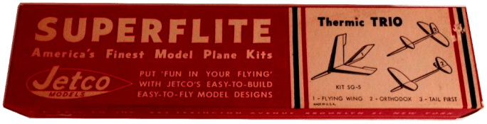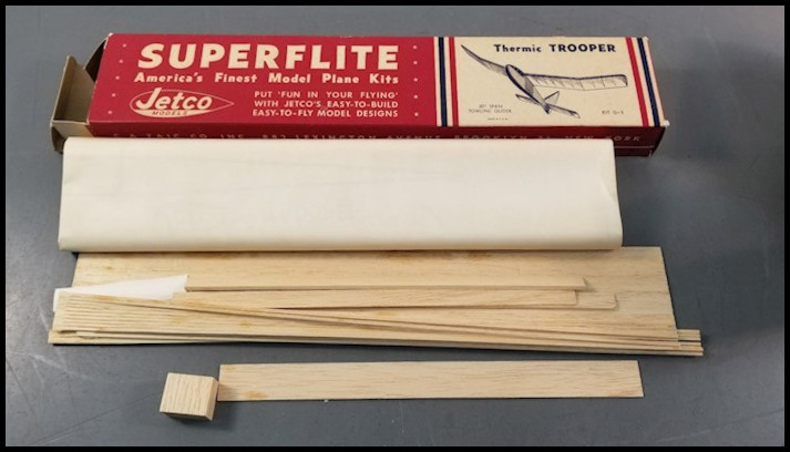 In the 7th grade I built and flew the Jetco Glider Trio, which had three different looking chuck gliders, and a year or so later I built a Jetco 30” span Trooper glider and then I scaled up the Trooper glider 50 percent and scratch built a 45” Super Trooper glider. Both these gliders were covered with silkspan, were towed up in the air with an electric motor driven handheld winch, and both flew gracefully.