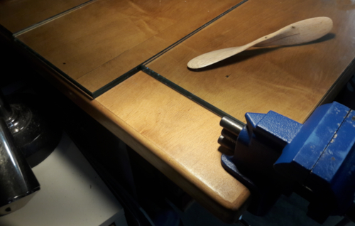 Glass is a perfect work top surface to do modeling on as a razor blade and Windex for the most part removes any glue or spills. Even drops of CA come up relatively easy. Tempered glass shelves with smooth edges are what I use. I have three 8″ x 24″ glass shelves that I picked up at a ReStore inexpensively that I place top to bottom on my desk as shown at right. Because they are relatively small, it allows me to easily clean them individually. Also I can slide the front one over to install my portable vice and when I’m done using it I can remove it and slide the glass back. Over everything I usually place a cutting mat, however I can slide it back if i need to do my work directly on the glass. Which leads me to my next point.