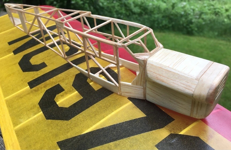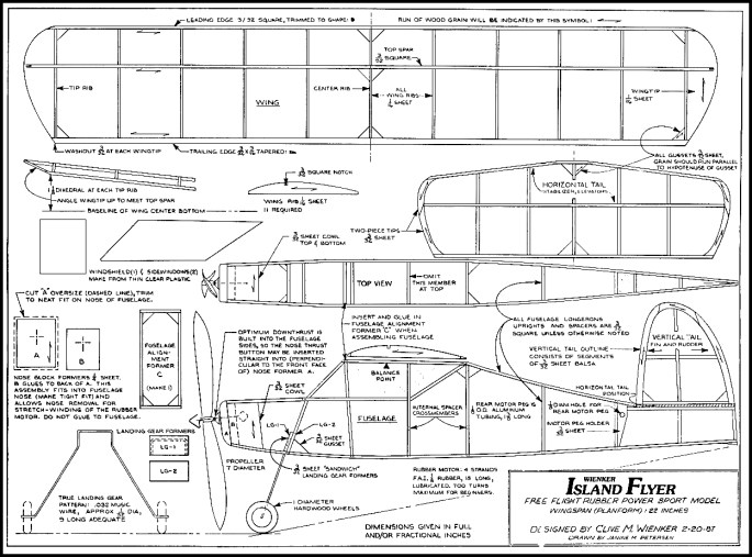 The build uses ready available 1/16″ sheet balsa and 3/32″ balsa cross section for most of the longerons and cross pieces. Drawn in February of 1987, it has stood the test of time.