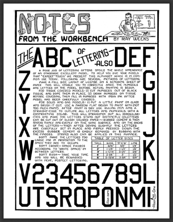 By using a program like Photoshop called GIMP I have produced an alphabet of numbers and letters in pdf form for aeromodelers to download and print that has reproduced Ray’s lettering and made it into a more usable form.