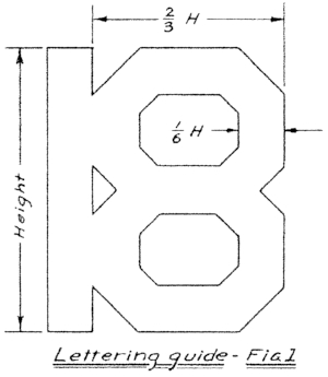 For outlining the smaller block numbers, such as those required on the tail group, much time will be saved if a lettering guide of the correct size and proportion is made. A lettering guide of this nature is shown in Fig. 1. Using this guide as a template, the outlines of any number and most letters can be quickly traced directly on the surface.