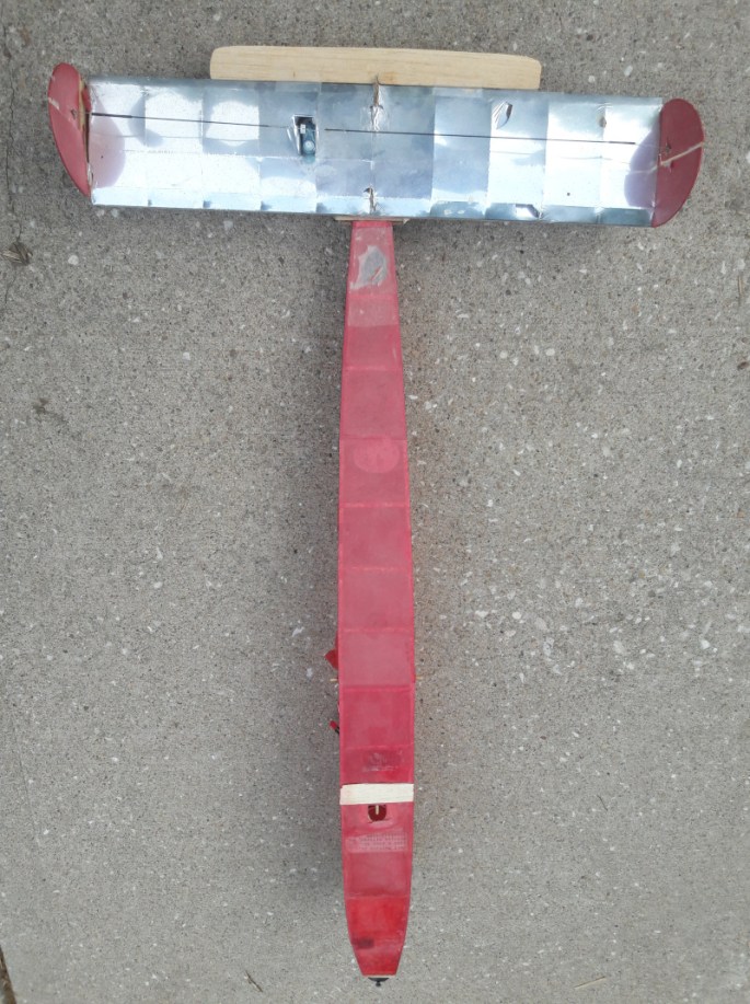 Note that the twin fins for this model now require them to have control surfaces as shown in photo. A suitable hinge must be made for the vertical joint so the “control flaps or panels” can move back and forth. Tyvec envelope paper makes a strong hing as well as thin silk cloth. In most cases it’s easier to make new fins using the old as a pattern..