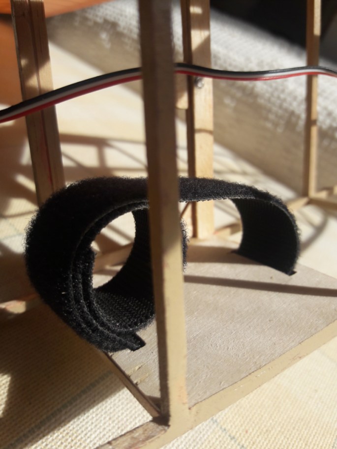 A cleverly placed rubber band is key to holding down the leading edge of the stabilizer. The tab you see built into the stab was an original feature that is shown on the drawing of the Altimeter Plan. Note how it is sandwiched between two ribs for strength and that its location makes it perfectly centered. Very effective.
