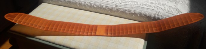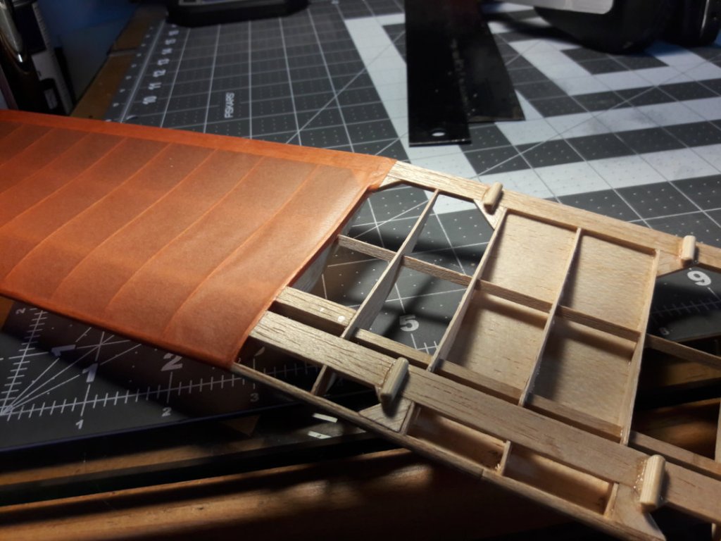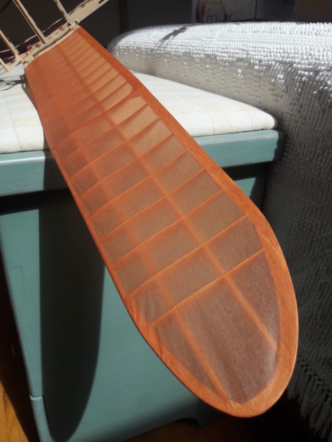 For the bottom of a wing that has an under-camber like the one shown at left, it is important that the tissue is attached to all of the ribs. Apply the glue stick to all of the ribs, top and bottom. Sometimes the tissue will pull away from the rib, especially during the shrinking process. To correct this, use a small paint brush dipped in Isopropyl alcohol to re-invigorate the dried glue under the tissue. Use gentle finger pressure (use the tips of 3 or 4 fingers all at once and rub back and forth) to make sure the tissue in question is re-glued. Patiently wait until the alcohol evaporates from the tissue before you let up on the pressure. Make sure in fact that it is really glued by gently twisting the wing in that spot and watching the tissue flex. Gluing all the rib surfaces top and bottom helps with the strength of the wing IMO. For more info on applying tissue see my Hints’n Tips page on this website.