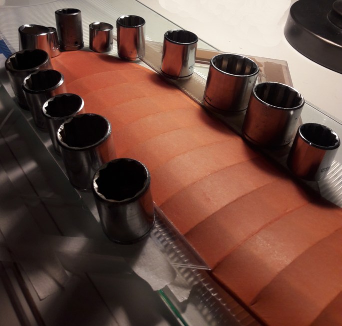 Through trial and error I have found that one must let this enamel coat dry for at least 3 days and then apply a top coat of Krylon Clear Spray. This is needed or else when you put on the tissue using a glue stick and use Isopropyl alcohol in the process, the alcohol will dissolve the enamel and cause it to leach into the tissue. Don’t ask me why.